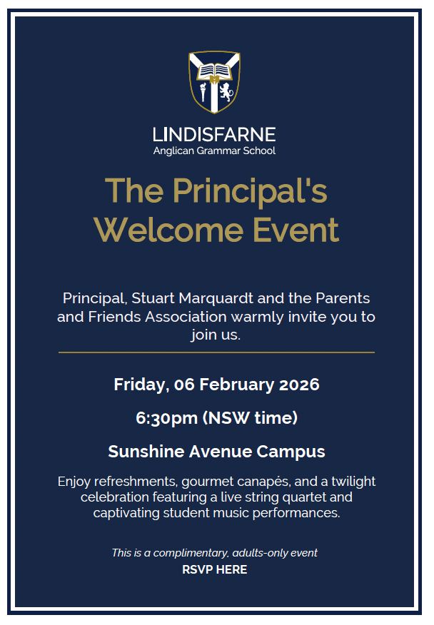 One of the great strengths of Lindisfarne is the way our parent community connects and supports the life of the School. Together with our Parents and Friends Association, I warmly invite all parents and guardians to join us for our annual Principal’s Welcome Event on Friday, 6 February, commencing at 6.30 pm (NSW time), hosted for our School Community. The venue will be our Sunshine Avenue Campus.