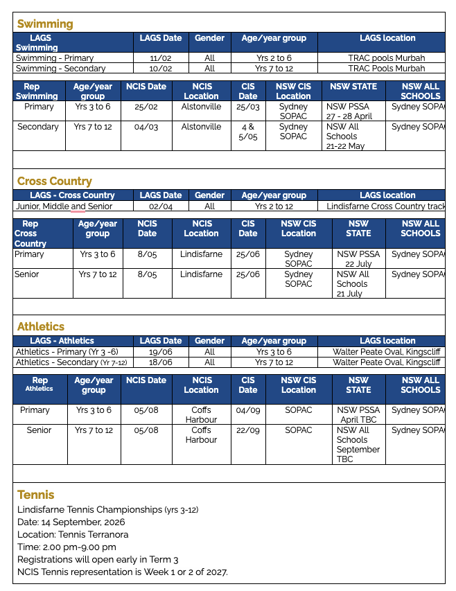 - Netball Trials Year 9, 10, 11, 12 (2026) players - Wednesday, 28 January 7 am - 8 am NSW